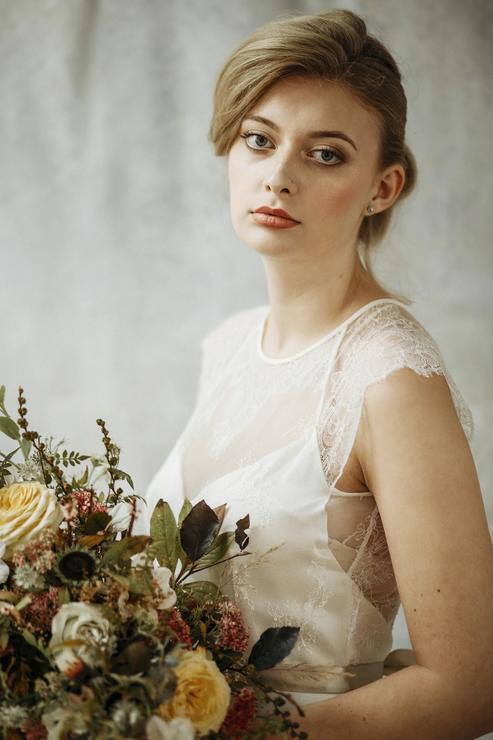 I worked with my studio neighbours here at Beehive Works on this little shoot – photographer Shelley Richmond and hair & make-up artist Jenn Edwards. Swallows & Damsons provided us with a stunning bouquet of autumnal blooms, and our beautiful teenage models Madison and Autumn came to us via Zebedee Models – a new agency that’s been getting a lot of national coverage as they exclusively represent models with disabilities.