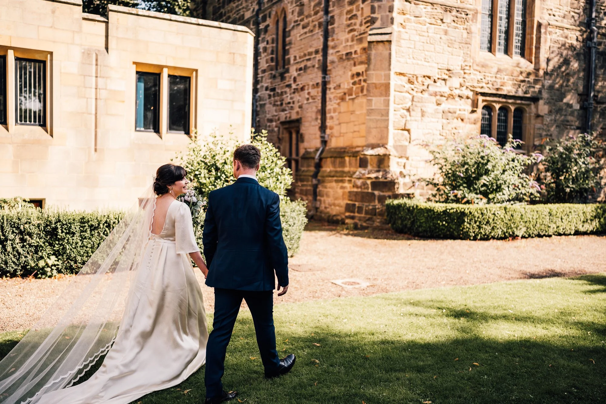 Frances’s gown was Lunaria, and we built up the bottom section of the open back a little so she could wear more supportive bra. A lace trimmed mantilla veil finished her look off perfectly, keeping the open back visible throughout.
